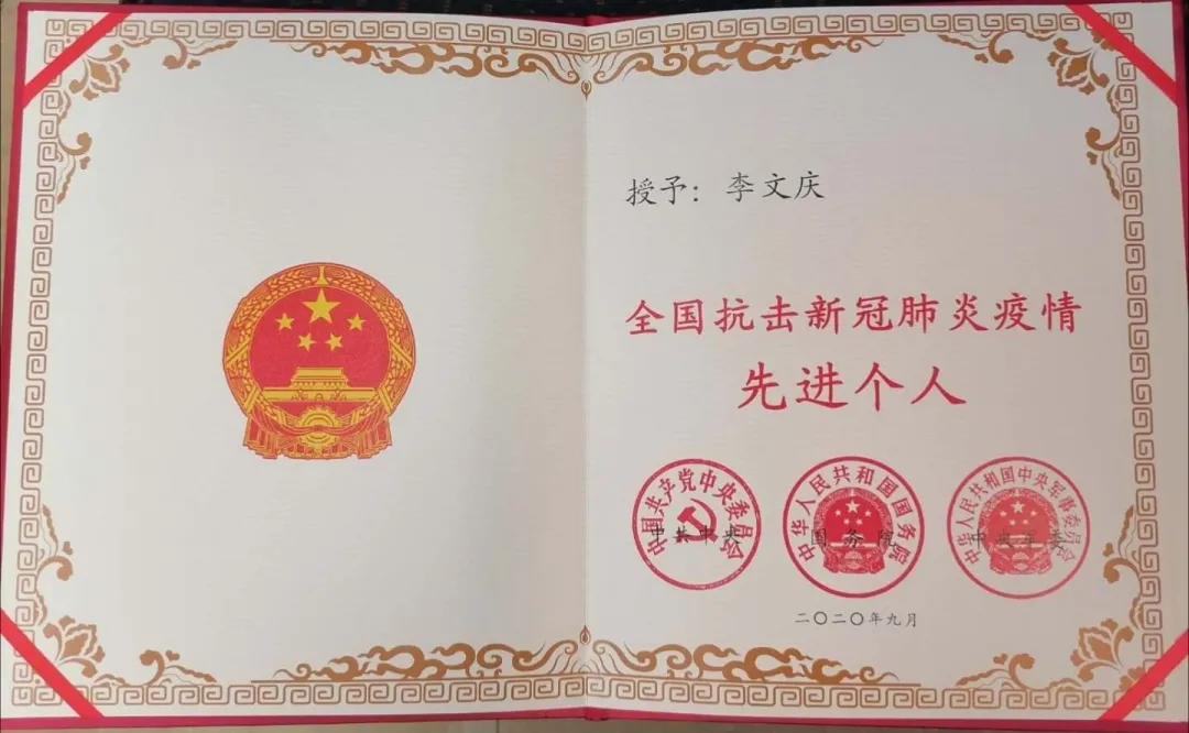 【北控城市资源的骄傲】全国抗击新冠肺炎疫情先进个人-李文庆 2020-09-09