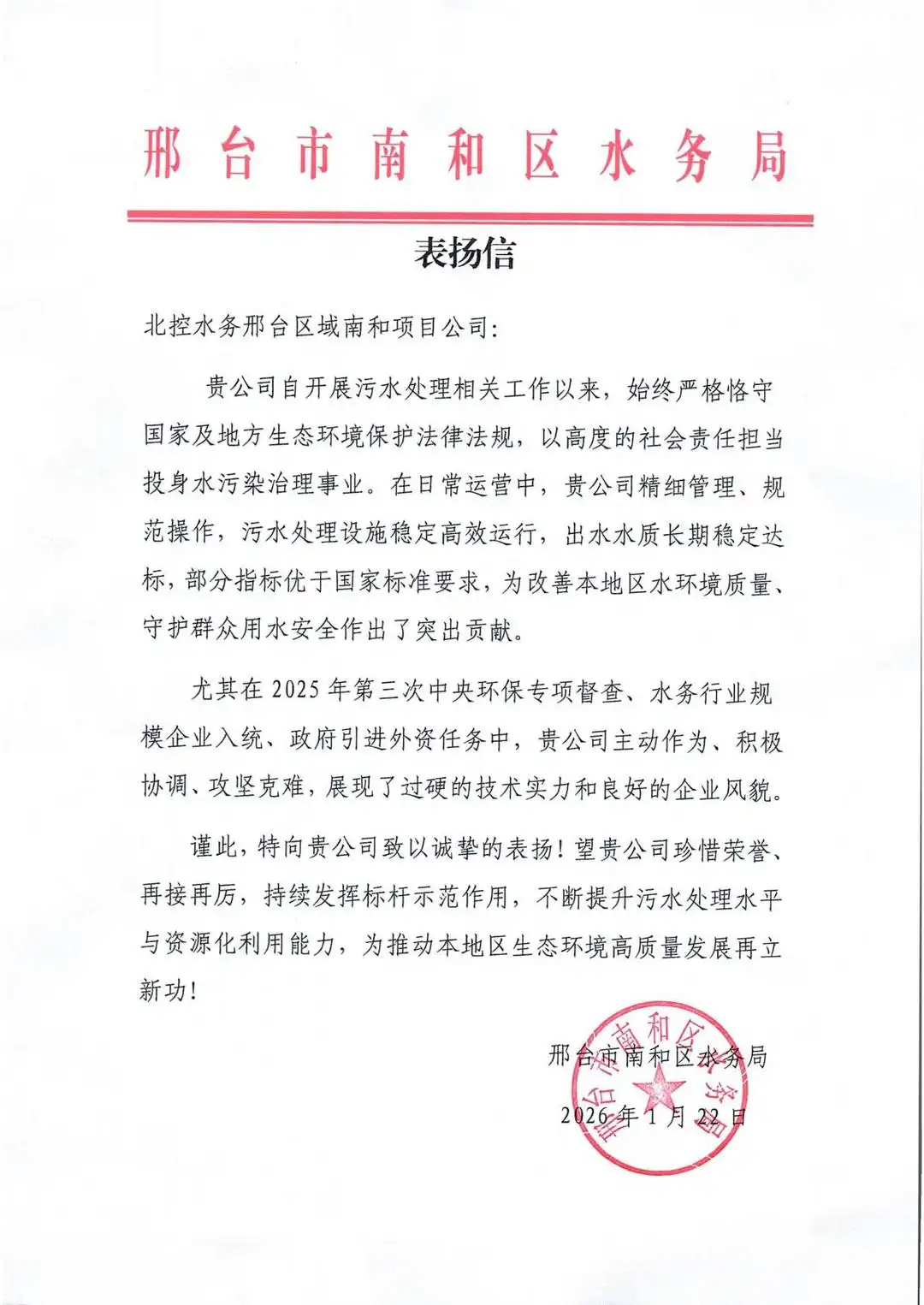 南和项目公司长期保持污水处理设施高效稳定运行,出水水质优于国家标准,在2025年中央环保专项督查、行业统计及政府引资等重要任务中主动协调、攻坚克难,展现出良好的企业风貌与专业实力,获得南和区水务局的专函表扬。