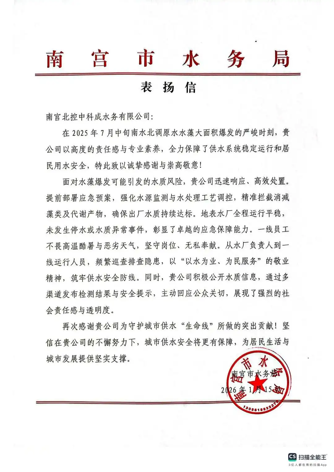 近日,北控水务邢台区域公司陆续收到邢台市、南宫市、清河县、南和区等属地政府及水务主管部门发来的表扬信,对公司在城乡供水保障、污水处理达标、应急响应及重大任务配合中展现的专业能力与社会担当给予高度认可和通报表扬。这一系列荣誉,集中体现了邢台区域各项目公司在区域水安全保障与生态环境治理中的标杆作用与责任践行。